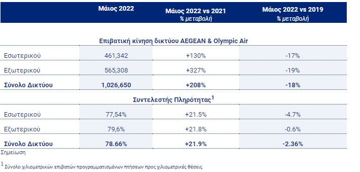 Σημαντική ανάκαμψη στην επιβατική κίνηση κατέγραψε η AEGEAN τον Μάιο του τρέχοντος έτους, μεταφέροντας περισσότερους από 1 εκατ. επιβάτες μόλις κατά την έναρξη της νέας καλοκαιρινής περιόδου. Ειδικότερα, η AEGEAN μετέφερε περισσότερους από 565 χιλ. επιβάτες στο δίκτυο εξωτερικού και περίπου 461 χιλ. επιβάτες στο δίκτυο εσωτερικού έχοντας επαναφέρει το 85% των συχνοτήτων της σε σχέση με το 2019. Χαρακτηριστικό των παραπάνω επιδόσεων είναι ότι η εταιρεία μετέφερε σε ένα μήνα σχεδόν όσους επιβάτες είχε μεταφέρει αθροιστικά κατά το 1ο τρίμηνο του έτους. Ο συντελεστής πληρότητας τον Μάϊο έφτασε σε σχεδόν 79%, με μέσο όρο επιβατών 122 επιβάτες ανά πτήση, φτάνοντας μάλιστα τα προ-πανδημίας επίπεδα κατά την τελευταία εβδομάδα του Μαΐου.