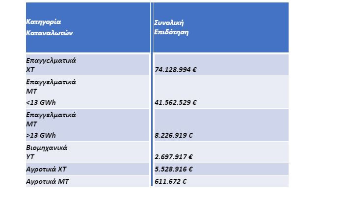 Η επιδότηση θα ανέλθει στο 50% του αυξημένου κόστους και αφορά όλη την μηνιαία κατανάλωση. Η μοναδιαία τιμή της επιδότησης ορίζεται σε 65€/MWh.