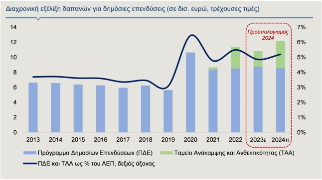 Σημαίνοντα ρόλο στην τόνωση της επενδυτικής δραστηριότητας κατέχουν οι δημόσιες επενδύσεις, οι οποίες καταγράφουν σημαντική ενίσχυση από το 2020 και μετά. Συγκεκριμένα, οι δαπάνες του Προγράμματος Δημοσίων Επενδύσεων (ΠΔΕ) αυξήθηκαν από Ευρώ 6,2 δισ., κατά μέσο όρο, το χρονικό διάστημα 2013-2019 σε Ευρώ 10,6 δισ. το 2020, με τη μεγάλη αυτή αύξηση να αποδίδεται στη χρηματοδότηση δράσεων για την αντιμετώπιση της υγειονομικής κρίσης, ενώ, τη διετία 2021-2022, διαμορφώθηκαν περίπου στα Ευρώ 8,4 δισ. Ωστόσο, από το 2021 οι επενδυτικές δαπάνες λαμβάνουν ώθηση και από τους πόρους του Ταμείου Ανάκαμψης και Ανθεκτικότητας (ΤΑΑ). Συγκεκριμένα, όσον αφορά στο 2023, οι επενδυτικές δαπάνες εκτιμώνται σε Ευρώ 8,8 δισ. μέσω του ΠΔΕ (Ευρώ 6,8 δισ. κοινοτικοί πόροι και Ευρώ 2 δισ. εθνικοί πόροι) και Ευρώ 2,1 δισ. μέσω του σκέλους των επιδοτήσεων του ΤΑΑ. Για το 2024, σύμφωνα με την Εισηγητική Έκθεση του Κρατικού Προϋπολογισμού για το 2024, προβλέπεται να δαπανηθούν επενδυτικοί πόροι ύψους Ευρώ 12,2 δισ. (5,2% του ΑΕΠ), εκ των οποίων Ευρώ 8,6 δισ. προέρχονται από το ΠΔΕ (Ευρώ 6,5 δισ. κοινοτικοί πόροι και Ευρώ 2,1 δισ. εθνικοί πόροι) και Ευρώ 3,6 δισ. από το ΤΑΑ. Σημειώνεται ότι, μετά από τη θετική αξιολόγηση της Ευρωπαϊκής Επιτροπής και την τελική έγκριση, το επόμενο διάστημα, από το Συμβούλιο Οικονομικών και Δημοσιονομικών Υποθέσεων (ECOFIN), του αιτήματος της χώρας μας για επιπλέον δανειακούς πόρους Ευρώ 5 δισ. και επιχορηγήσεις Ευρώ 795 εκατ., τα συνολικά κεφάλαια από το ΤΑΑ (επιχορηγήσεις και δάνεια) αναμένεται να ανέλθουν σε Ευρώ 36 δισ. έως το 2026. Το γεγονός αυτό καταδεικνύει τη σημασία της απρόσκοπτης υλοποίησης του σχεδίου «Ελλάδα 2.0». Μέχρι σήμερα έχουν εκταμιευτεί Ευρώ 11,1 δισ. (Ευρώ 5,75 δισ. σε επιχορηγήσεις και Ευρώ 5,35 δισ. σε δάνεια) και εκκρεμεί αίτημα για εκταμίευση επιπλέον Ευρώ 3,6 δισ., ενώ έχουν ενταχθεί 718 έργα συνολικού προϋπολογισμού Ευρώ 20,7 δισ.