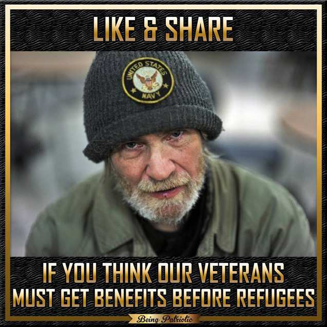 Έχει τίτλο: Κάντε like και κοινοποιήστε αν πιστεύετε ότι οι βετεράνοι μας πρέπει να λαμβάνουν κοινωνικές παροχές πριν από τους πρόσφυγες.