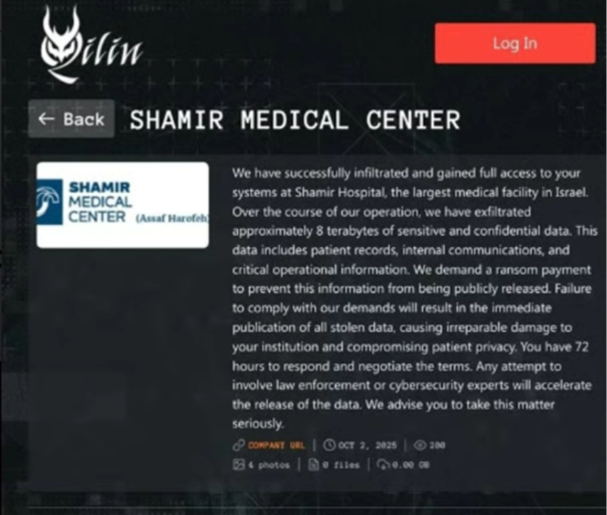 Τον Οκτώβριο του 2025, το Ισραηλινό Ιατρικό Κέντρο Shamir επλήγη από μια μεγάλη κυβερνοεπίθεση που αρχικά περιγράφηκε ως περιστατικό ransomware. Οι επιτιθέμενοι ισχυρίστηκαν ότι είχαν κλέψει μεγάλη ποσότητα δεδομένων και ζήτησαν λύτρα με αντάλλαγμα τη μη δημοσίευσή τους. Ισραηλινοί αξιωματούχοι δήλωσαν ότι η επίθεση δεν επηρέασε τη λειτουργία του νοσοκομείου και η φροντίδα των ασθενών δεν διαταράχθηκε σημαντικά. Ωστόσο, ορισμένες πληροφορίες φαίνεται να έχουν διαρρεύσει, συμπεριλαμβανομένης περιορισμένης αλληλογραφίας μέσω email και ορισμένων ιατρικών δεδομένων.
