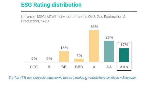 Η Morgan Stanley Capital Index (MSCI) αναγνωρίζει με τον πλέον εμφατικό τρόπο την ηγετική θέση που έχει η Energean ως εταιρεία, που εκτός από το φυσικό αέριο, εστιάζει σε κάθε περιοχή όπου δραστηριοποιείται στο Περιβάλλον, την Κοινωνία και την Εταιρική Διακυβέρνηση, τα γνωστά ως κριτήρια ESG (Environment, Social, Governance).