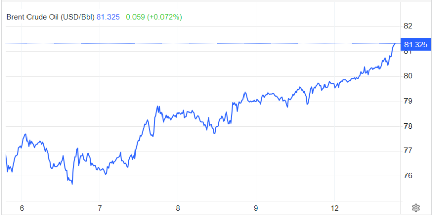 Τα συμβόλαια μελλοντικής εκπλήρωσης για το Brent αυξήθηκαν στα 80,5 δολάρια ανά βαρέλι τη Δευτέρα, σημειώνοντας την πέμπτη συνεχόμενη άνοδό τους, λόγω των ανησυχιών για διακοπή της προσφοράς εν μέσω αυξανόμενων εντάσεων στη Μέση Ανατολή.
