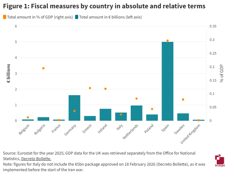 Συνολικά, οι ευρωπαϊκές κυβερνήσεις έχουν μέχρι στιγμής δεσμεύσει σχεδόν 10,46 δισεκατομμύρια ευρώ σε δημοσιονομικά μέτρα για να μετριάσουν τις επιπτώσεις του πολέμου ΗΠΑ-Ιράν στους λογαριασμούς ενέργειας. Σε απόλυτους αριθμούς, η Ισπανία και η Γερμανία έχουν δεσμευτεί με μεγάλη διαφορά τις περισσότερες, με την Ισπανία από μόνη της να αντιπροσωπεύει σχεδόν το ήμισυ του συνόλου.
