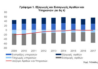 Ειδικότερα, όπως φαίνεται στο Γράφημα 1, οι εξαγωγές αγαθών και υπηρεσιών αυξήθηκαν την περίοδο 2009 – 2017 κατά 25% και ανήλθαν σε € 56,2 δισ. το 2017. Η άνοδος των συνολικών εξαγωγών προήλθε σε μεγαλύτερο βαθμό από τις εξαγωγές αγαθών, οι οποίες παρουσίασαν για το ίδιο χρονικό διάστημα αύξηση κατά 57,6%. Παράλληλα, οι εισαγωγές παρουσίασαν πτωτική τάση, καθώς μειώθηκαν κατά τη διάρκεια της περιόδου 2009 – 2017 κατά 14% (2017: € 66,5 δισ., 2009: 57,2 € δισ.) αφού το διαθέσιμο εισόδημα και η επενδυτική δαπάνη υποχωρούσαν, με αποτέλεσμα τη μείωση των εισαγωγών κεφαλαιουχικών και καταναλωτικών αγαθών.