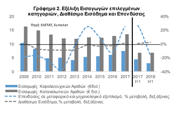 Ειδικότερα, όπως παρουσιάζεται στο Γράφημα 2, οι εισαγωγές κεφαλαιουχικών αγαθών υποχώρησαν κατά €2,9 δισ. στην περίοδο 2009-2017, ενώ οι εισαγωγές καταναλωτικών αγαθών, που αποτελούν το μεγαλύτερο μέρος των εισαγωγών, μειώθηκαν στην ίδια περίοδο κατά € 2,7 δισ. Οι ανωτέρω εξελίξεις συνάδουν με την πτωτική πορεία που ακολούθησαν οι επενδύσεις σε μηχανολογικό και μεταφορικό εξοπλισμό (μπλε διακεκομμένη γραμμή στο Γράφημα 2) και εξηγούν την πτώση των εισαγωγών σε κεφαλαιουχικά αγαθά. Αντιστοίχως, η μείωση του διαθεσίμου εισοδήματος εξηγεί εν μέρει τη μείωση των εισαγωγών καταναλωτικών αγαθών.
