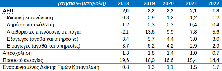 Στο πλαίσιο αυτό, ο ρυθμός ανάπτυξης προβλέπεται να διαμορφωθεί σε +2,2% το 2019, σύμφωνα με τις τελευταίες εκτιμήσεις της Ευρωπαϊκής Επιτροπής, με κύριο μοχλό την αύξηση των επενδύσεων σε πάγια κατά +13,6% και την ενίσχυση της ιδιωτικής κατανάλωσης κατά +0,9%. Η εκτίμηση αυτή είναι αναθεωρημένη προς τα πάνω σε σύγκριση με τις φθινοπωρινές προβλέψεις της ΕΕ, που ανακοινώθηκαν στις 8/11/2018, καθώς περιλαμβάνει το νέο μείγμα μέτρων του Προϋπολογισμού του 2019 (κυρίως τη μη περικοπή συντάξεων). Αυτό, σύμφωνα με την ΕΕ, θα δώσει βραχυπρόθεσμα ώθηση στον ρυθμό ανάπτυξης κατά 0,2-0,3 π.μ., ο οποίος, όμως, θα επιστρέψει από το 2022 σε επίπεδα κατώτερα του 2018.