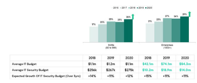 Το μερίδιο του ΙΤ προϋπολογισμού που αφιερώνεται στην ασφάλεια συνεχίζει να αυξάνεται από έτος σε έτος, παρόλο που ο συνολικός ΙΤ προϋπολογισμός έχει μειωθεί από 1,2 εκατομμύρια δολάρια το 2019 σε 1,1 εκατομμύρια δολάρια το 2020 μεταξύ των ΜμΕ και από 74,1 εκατομμύρια δολάρια σε 54,3 εκατομμύρια δολάρια για τις μεγάλες επιχειρήσεις. Αυτή η μείωση μπορεί να οφείλεται στις συνέπειες της παγκόσμιας πανδημίας του κορωνοϊού, σύμφωνα με την Gartner, της οποίας οι ειδικοί προέβλεψαν επίσης ότι οι προϋπολογισμοί θα μειωθούν.