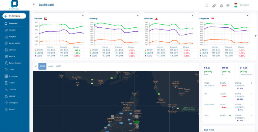 Μέσα από μία σειρά εργαλείων όπως αναλύσεις δεδομένων και προβλέψεις για τις τιμές του πετρελαίου (data analytics & oil price forecasting) σε πραγματικό χρόνο αλλά και αλγόριθμους που συνυπολογίζουν όλες τις πληροφορίες της παγκόσμιας αγοράς ναυτιλιακών καυσίμων, η πλατφόρμα NEREUS, παρέχει τη δυνατότητα ολοκλήρωσης της διαδικασίας αγοράς του πετρελαίου, στο κατάλληλο λιμάνι, στον κατάλληλο χρονισμό και από τον κατάλληλο πάροχο.