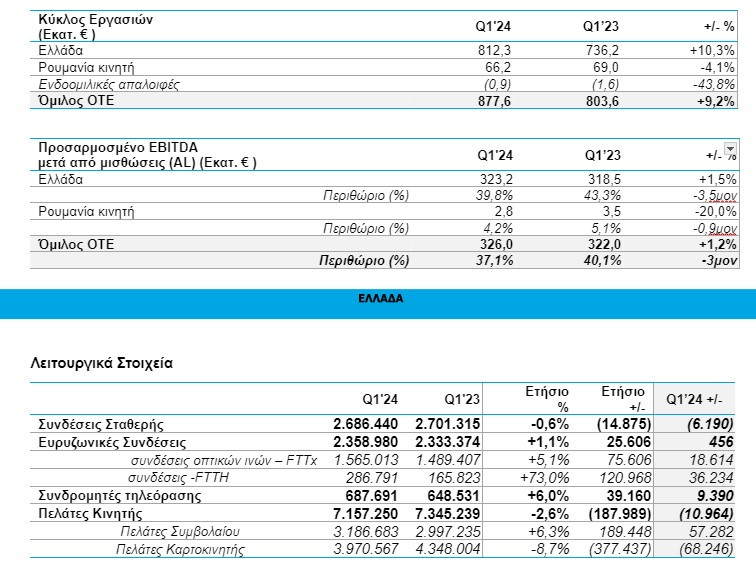 Το Α’ τρίμηνο του 2024, τα ενοποιημένα έσοδα του Ομίλου OTE αυξήθηκαν κατά 9,2% και διαμορφώθηκαν σε €877,6 εκατ., λόγω ισχυρών επιδόσεων στην Ελλάδα. Στην Ελλάδα, τα έσοδα αυξήθηκαν κατά 10,3% στα €812,3 εκατ., χάρη στις ισχυρές επιδόσεις στην κινητή, τις υπηρεσίες τηλεόρασης, τις υπηρεσίες ευρυζωνικότητας και ιδίως τα έργα ICT. Στην Ρουμανία, τα έσοδα μειώθηκαν κατά 4,1% και διαμορφώθηκαν στα €66,2 εκατ., αντανακλώντας την επίδραση από τη μείωση στα τέλη τερματισμού κινητής τηλεφωνίας καθώς και προωθητικές ενέργειες προηγούμενων περιόδων με στόχο τη συγκράτηση της πελατειακής βάσης.