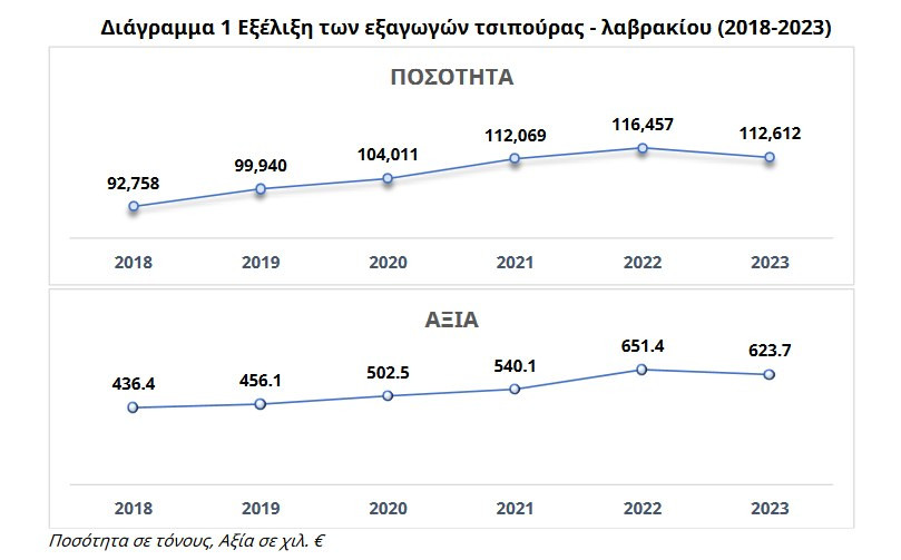 Οι συνολικές ποσότητες εξαγωγής καλύπτουν το 90% του συνολικού όγκου παραγωγής τα τελευταία χρόνια. Οι εξαγόμενες ποσότητες τσιπούρας και λαβρακίου σημείωσαν μείωση 3,3% το 2023, ύστερα από συνεχή ανοδική πορεία που ακολούθησαν την προηγούμενη 5ετία (2018- 2022).