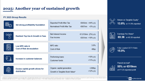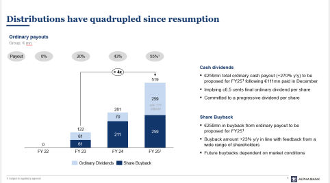 Η συνεχιζόμενη ενίσχυση της κεφαλαιακής βάσης και η ισχυρή οργανική δημιουργία κεφαλαίου επιτρέπουν στην Τράπεζα να εξετάζει προοδευτικά υψηλότερα ποσοστά διανομής, με στόχο την προβλέψιμη και αυξανόμενη απόδοση για τους μετόχους. Η στρατηγική αυτή ευθυγραμμίζεται με την επιδίωξη της Alpha Bank να διατηρεί ευελιξία μεταξύ μετρητών και επαναγορών μετοχών, ανάλογα με τις συνθήκες της αγοράς και τις ευκαιρίες κεφαλαιακής αξιοποίησης.