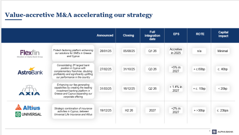 Οι εξαγορές των FlexFin, AXIA Ventures και Astrobank αναμένεται να ενσωματωθούν πλήρως στον Όμιλο Alpha Bank έως το γ’ τρίμηνο του 2026, ενισχύοντας τη βάση επαναλαμβανόμενων εσόδων και τις δυνατότητες του Ομίλου σε τομείς υψηλής προστιθέμενης αξίας, δημιουργώντας προϋποθέσεις για περαιτέρω αύξηση της κερδοφορίας τα επόμενα χρόνια.. Οι συναλλαγές αυτές εκτιμάται ότι θα έχουν θετική επίδραση στα κέρδη ανά μετοχή (EPS) και στη λειτουργική απόδοση του κεφαλαίου (RoTE), συμβάλλοντας στη σταδιακή ενίσχυση της κερδοφορίας και της ποιότητας των εσόδων.