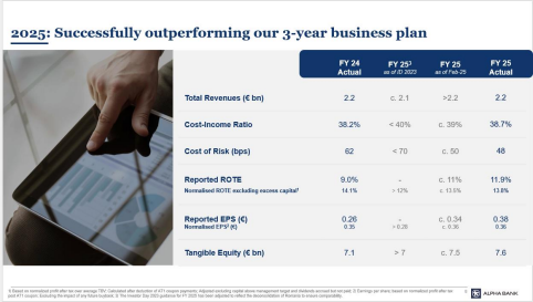 Το 2025 σηματοδότησε την επιτυχή ολοκλήρωση του τριετούς στρατηγικού σχεδίου 2023-2025, με την Alpha Bank να υπερκαλύπτει τους βασικούς στόχους που είχε θέσει σε επίπεδο κερδοφορίας, αποδοτικότητας και κεφαλαιακής ισχύος, επιβεβαιώνοντας τη δυναμική του επιχειρηματικού της μοντέλου.