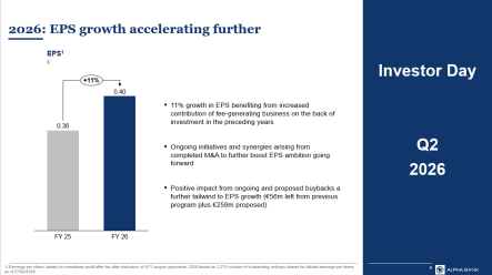 Για το 2026, η Alpha Bank εκτιμά ότι η αύξηση των κερδών ανά μετοχή θα επιταχυνθεί, με τα προσαρμοσμένα EPS να αναμένεται να ενισχυθούν κατά περίπου 11%, αντανακλώντας την ενίσχυση της επαναλαμβανόμενης κερδοφορίας. Η διοίκηση επισημαίνει ότι το 2026 αποτελεί μεταβατικό έτος, καθώς ο Όμιλος επικεντρώνεται στην πλήρη ενσωμάτωση των πρόσφατων εξαγορών, με τις αναμενόμενες συνέργειες να αποτυπώνονται σταδιακά. Η προβλεπόμενη αύξηση της κερδοφορίας βασίζεται σε διατηρήσιμες πηγές εσόδων, με περαιτέρω ενίσχυση της συνεισφοράς των δραστηριοτήτων προμηθειών και πειθαρχημένη διαχείριση κόστους. Περισσότερες λεπτομέρειες για τις μεσοπρόθεσμες προοπτικές και τους στόχους του Ομίλου θα παρουσιαστούν στο Investor Day, το δεύτερο τρίμηνο του 2026.