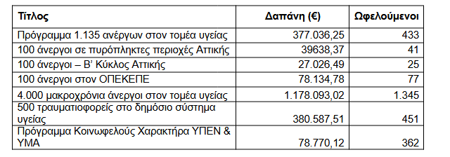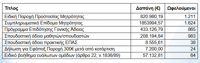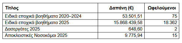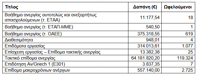 Παρουσιάζονται αναλυτικά οι συνολικές δαπάνες και ο αριθμός ωφελουμένων, οργανωμένες σε τέσσερις βασικές κατηγορίες.