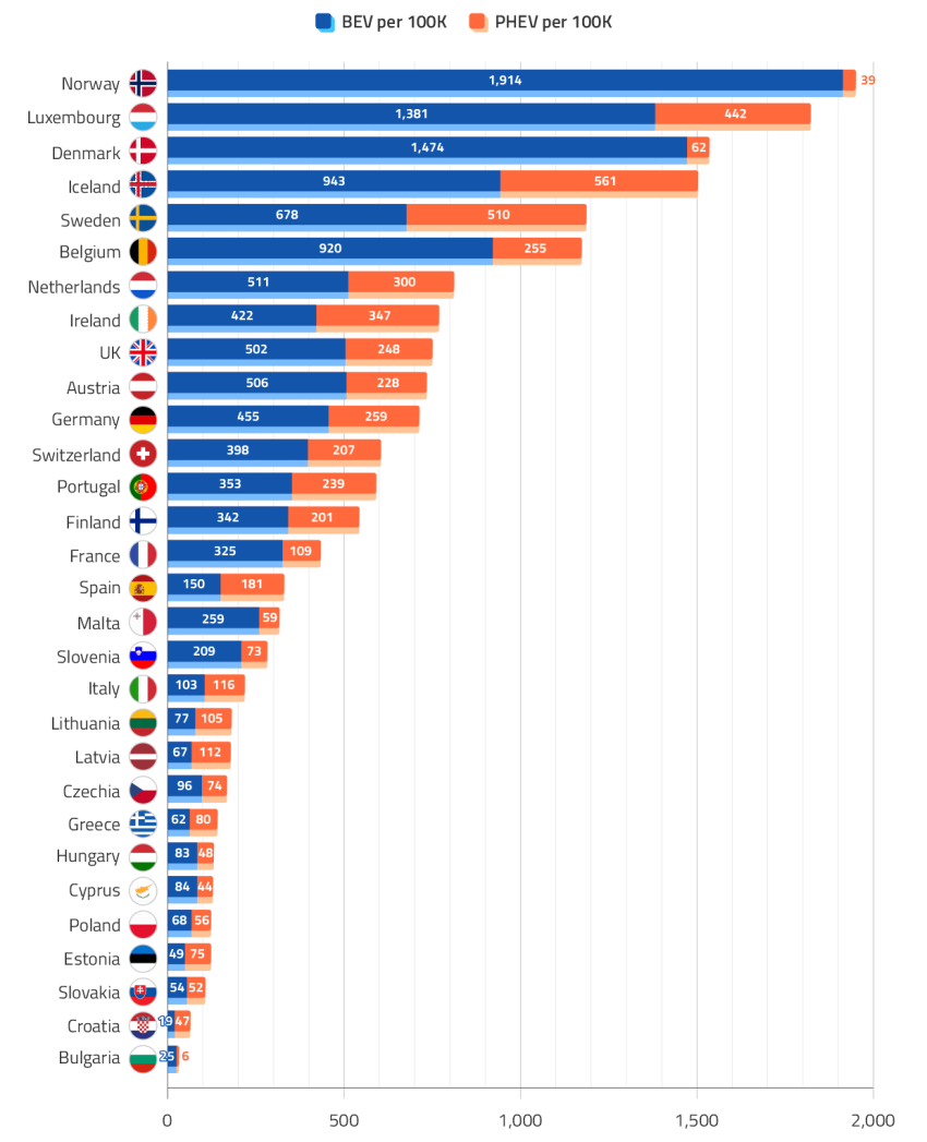 Μεταξύ των πλουσιότερων χωρών της Ευρώπης , της Νορβηγίας, του Λουξεμβούργου, της Δανίας, της Ελβετίας και του Βελγίου, τα BEV κυριαρχούν πλέον στην αγορά , ένα μοτίβο που βασίζεται στα υψηλά διαθέσιμα εισοδήματα, τα καλά χρηματοδοτούμενα προγράμματα κινήτρων και την πυκνή κάλυψη χρέωσης. Μαζί, αυτοί οι παράγοντες καταδεικνύουν πώς η οικονομική ισχύς και η συνέπεια των πολιτικών μεταφράζονται σε ταχύτερη και βαθύτερη απαλλαγή των οδικών μεταφορών από τις ανθρακούχες εκπομπές.