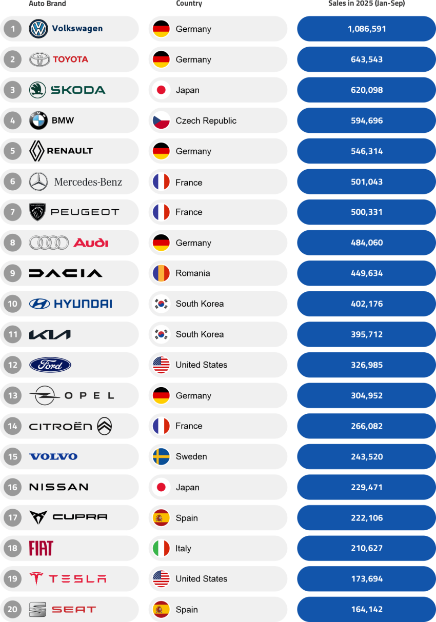 Το 2025, η Γερμανία επιβεβαιώνει την κυριαρχία της στην αγορά ηλεκτρικών οχημάτων της Ευρώπης: Η Volkswagen βρίσκεται στην πρώτη γραμμή με περισσότερες από 1,08 εκατομμύρια μονάδες που πωλήθηκαν μεταξύ Ιανουαρίου και Σεπτεμβρίου. Οι BMW, Mercedes-Benz και Audi ενισχύουν την υπεροχή της χώρας, καταλαμβάνοντας άνετα θέσεις στην πρώτη δεκάδα. Οι 620.000 μονάδες της Škoda υπογραμμίζουν περαιτέρω το εύρος και τη συνοχή του χαρτοφυλακίου του ομίλου Volkswagen, ενώ οι γαλλικές Renault, Peugeot και Citroën συνεισφέρουν συλλογικά πάνω από 1,3 εκατομμύρια ηλεκτρικά οχήματα, αποδεικνύοντας ότι οι παραδοσιακές αυτοκινητοβιομηχανίες της Δυτικής Ευρώπης παραμένουν δυνατοί παίκτες στη μετάβαση στην ηλεκτροκίνηση.
