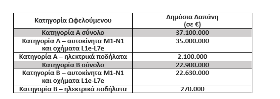Οι νέοι πόροι κατευθύνονται στις επιδοτήσεις οχημάτων νομικών προσώπων (κατηγορία Β) και ποδηλάτων φυσικών προσώπων (Κατηγορία Α). Η νέα κατανομή του προϋπολογισμού έχει ως εξής: