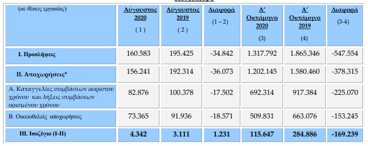 Από τη σύγκριση των στοιχείων των δύο μηνών, Αύγουστος 2020 και Αύγουστος 2019, προκύπτει αυξημένη επίδοση κατά 1.231 περισσότερων θέσεων εργασίας για τον Αύγουστο 2020 (θετικό ισοζύγιο 4.342 θέσεων εργασίας) έναντι θετικού ισοζυγίου (3.111) τον Αύγουστο του 2019. Αθροιστικά για την περίοδο Ιανουάριος – Αύγουστος 2020, οι αναγγελίες προσλήψεων ανήλθαν στις 1.317.792 θέσεις εργασίας και οι αποχωρήσεις έφτασαν τις 1.202.145, εκ των οποίων οι 692.314 ήταν αποτέλεσμα καταγγελιών συμβάσεων αορίστου χρόνου ή λήξεων συμβάσεων ορισμένου χρόνου και οι 509.831 οικειοθελείς αποχωρήσεις.