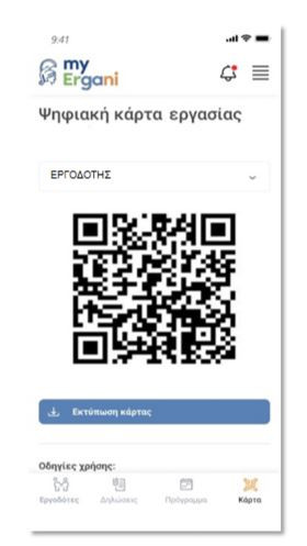 Στην εφαρμογή myErgani app θα ενεργοποιηθούν πρόσθετες δυνατότητες για την παρακολούθηση της πραγματικής απασχόλησης μέσω του Π.Σ. Εργάνη, στο πλαίσιο του έργου «Ενιαίο Πληροφοριακό Σύστημα Παρακολούθησης της Αγοράς Εργασίας - Κάρτα Εργασίας». Πιο συγκεκριμένα, μέσα από την εφαρμογή myErgani app θα είναι διαθέσιμη από 1ης Ιουλίου 2022 η Ψηφιακή Κάρτα Εργασίας (σε μορφή QR Code) κάθε εργαζόμενου στις επιχειρήσεις – εργοδότες της πρώτης φάσης εφαρμογής της Ψηφιακής Κάρτας Εργασίας.