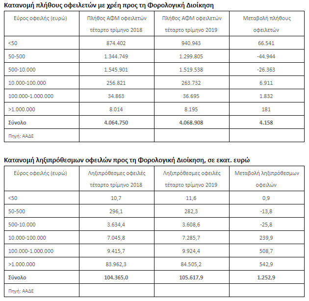 Καθοριστική είναι η συνεισφορά των νομικών προσώπων στην αύξηση του ληξιπρόθεσμου υπολοίπου της κατηγορίας άνω του 1 εκατ. ευρώ, καθώς από αυτά πηγάζει το 72% της αύξησης των ληξιπρόθεσμων οφειλών σε σύγκριση με το προηγούμενο έτος, δηλαδή 389,2 εκατ. ευρώ, ενώ το ύψος του ληξιπρόθεσμου υπολοίπου τους σε αυτήν την κατηγορία οφειλής άγγιξε κατά το τέλος του 2019 τα 61.523 εκατ. ευρώ. Αντίστοιχα το πλήθος των νομικών προσώπων που οφείλουν πάνω από 1 εκατ. ευρώ διαμορφώθηκε στα 4.987, καθώς αυξήθηκε σε ετήσια βάση κατά 132 νέα νομικά πρόσωπα.
