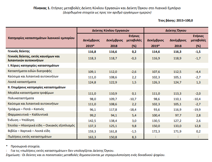 Όπως ανακοίνωσε η ΕΛΣΤΑΤ, ο γενικός δείκτης όγκου (κύκλος εργασιών σε σταθερές τιμές) παρουσίασε μείωση 1,5% τον Δεκέμβριο 2019 σε σύγκριση με τον αντίστοιχο δείκτη του Δεκεμβρίου 2018, ενώ σε σύγκριση με τον αντίστοιχο δείκτη του Νοεμβρίου 2019 σημείωσε αύξηση 11,9%. Ο εποχικά διορθωμένος γενικός δείκτης παρουσίασε μείωση 3,2% τον Δεκέμβριο 2019 σε σύγκριση με τον αντίστοιχο δείκτη του Νοεμβρίου 2019.