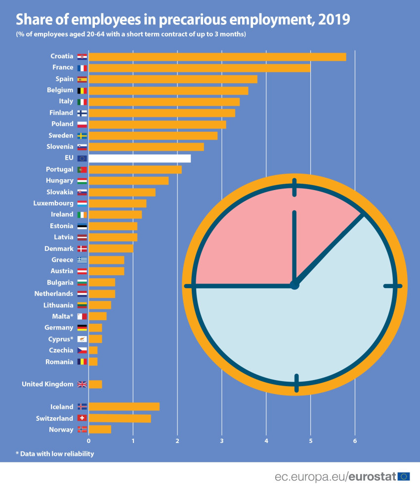 Τι σημαίνει «precarious job» κατά την Eurostat; Η αβέβαιη θέση απασχόλησης. Και πώς το προσδιορίζει αυτό; Κάνοντας αναφορά σε εργαζόμενους, των οποίων η σύμβαση δεν ξεπερνά τους 3 μήνες. Ποιο ήταν το ποσοστό αυτών των εργαζομένων το 2019; Έφτανε το 2,3% μεσοσταθμικά στην Ευρωπαϊκή Ένωση, καταγράφοντας, μάλιστα, μια σταθερότητα ως ποσοστό της απασχόλησης καθ’ όλη τη διάρκεια της προηγούμενης δεκαετίας. Όλα αυτά είναι, όμως, παρελθόν.
