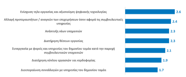 Επίσης, εξετάσθηκαν οι σημαντικότερες προκλήσεις που αντιμετωπίζουν οι εταιρείες συμβούλων επιχειρήσεων - μέλη του ΣΕΣΜΑ στην παρούσα συγκυρία. Το μεγαλύτερο σκορ έλαβε η ενίσχυση της τηλεργασίας και αξιοποίηση της ψηφιακής τεχνολογίας, ενώ ακολουθεί η ανάγκη κατανόησης των προτεραιοτήτων των επιχειρήσεων, ώστε συνακόλουθα οι συμβουλευτικές εταιρείες να διαμορφώσουν τις αντίστοιχες υπηρεσίες που να καλύπτουν τις νέες ανάγκες.