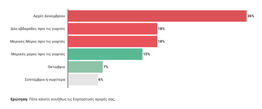Το μόνο σίγουρο είναι ότι οι καταναλωτές στην Ελλάδα δεν θα αξιοποιήσουν τη “Μαύρη Παρασκευή” για τις... χριστουγεννιάτικες υποχρεώσεις τους. Επί της ουσίας, οι Έλληνες δεν φαίνεται να ακολουθούν την τάση που επικρατεί στις περισσότερες Ευρωπαϊκές αγορές, με τους καταναλωτές εκεί να συνδυάζουν όλο και περισσότερο τις χριστουγεννιάτικες αγορές με τις εκπτώσεις του Black Friday. Στη χώρα μας το 36% δήλωσε ότι κάνει κυρίως τις εορταστικές αγορές του την πρώτη εβδομάδα του Δεκεμβρίου, ποσοστό που είναι το υψηλότερο ανάμεσα στις 10 χώρες που διενεργήθηκε η έρευνα.