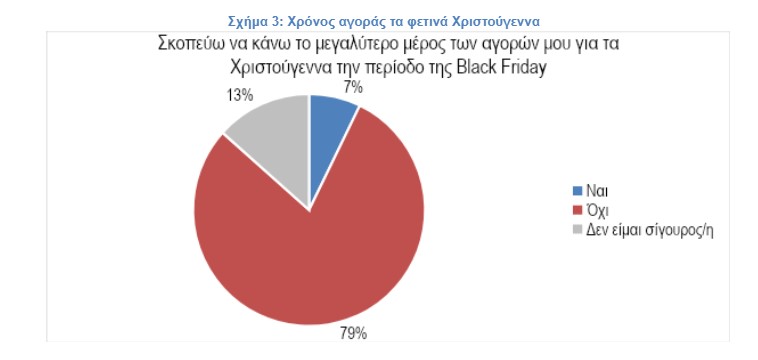 Ένα σημαντικό μερίδιο αυτών των αγορών αφορούν τις αγορές των Χριστουγέννων, όπως καταγράφεται στο σχήμα 2. Συγκεκριμένα από το 20% το οποίο θα πραγματοποιήσει αγορές την περίοδο του Black Friday το 7%, δηλαδή περίπου 1 στους 3, θα κάνει το μεγαλύτερο μέρος των αγορών του για τα Χριστούγεννα την περίοδο του Black Friday.