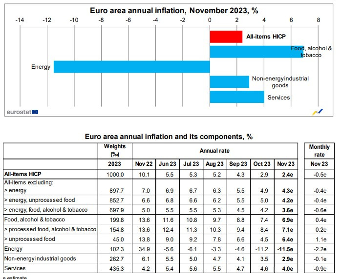 Στην Ευρωζώνη ο πληθωρισμός σημείωσε επίσης επιβράδυνση σε ετήσια βάση, διαμορφούμενος στο 2,4%, από 2,9%, ενώ σε μηνιαία βάση επίσης κατέγραψε αρνητικό ρυθμό μεταβολής στο -0,5%. Είναι ενδεικτικό ότι από τις 20 χώρες που μοιράζονται το ευρώ, μόνο στο Βέλγιο καταγράφηκε αρνητικός ρυθμός μεταβολής του πληθωρισμού σε ετήσια βάση στο -0,7%.