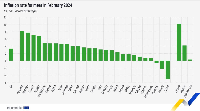 Τον Φεβρουάριο η τιμή του κρέατος στην ΕΕ ήταν κατά 3,3% υψηλότερη από ό,τι τον Φεβρουάριο του 2023. Το χοιρινό κρέας σημείωσε τη μεγαλύτερη αύξηση κατά 5,7%, μπροστά από το αρνί και το κατσίκι (+4,5%) και το μοσχάρι (+3%). Τα πουλερικά, αντίθετα, κατέγραψαν μείωση 1,6% σε σύγκριση με τον Φεβρουάριο του 2023.