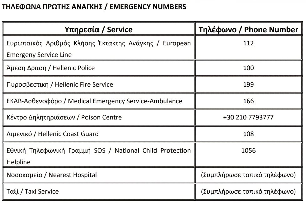 Eνδεικτικός πίνακας με τα τηλέφωνα πρώτης ανάγκης που θα πρέπει να υπάρχουν από εδώ και στο εξής σε όλα τα καταλύματα βραχυχρόνιας μίσθωσης.