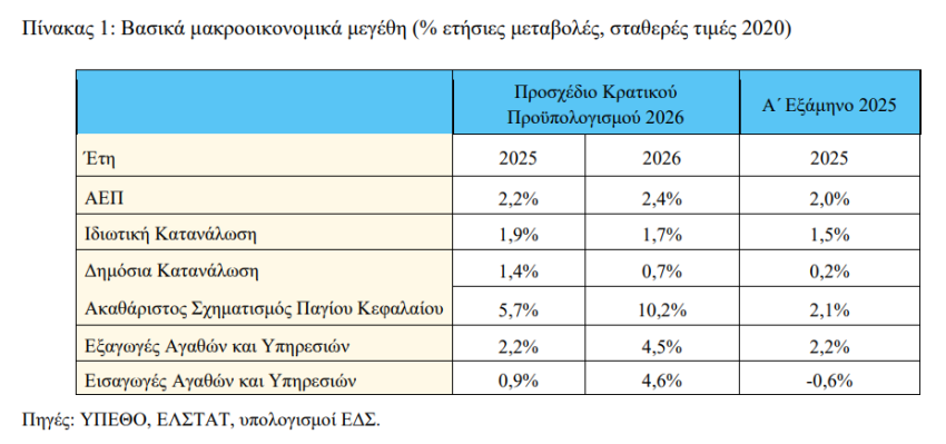 Το ΕΔΣ προβλέπει ρυθμό ανάπτυξης του ΑΕΠ για το 2025 2,2% και για το 2026 2,3%, οριακά πιο συγκρατημένο από την πρόβλεψη του ΠΚΠ 2026 2,4%. Οι παραπάνω προβλέψεις για τον ρυθμό μεγέθυνσης υποστηρίζονται και από τις αντίστοιχες εκτιμήσεις διεθνών και εγχώριων οργανισμών, αποτυπώνοντας τη θετική προοπτική της ελληνικής οικονομίας. Η διατήρηση υψηλού ρυθμού απορρόφησης των πόρων του Ταμείου Ανθεκτικότητας και Ανάπτυξης είναι κρίσιμη για τη συνέχιση της αναπτυξιακής δυναμικής και το 2026.