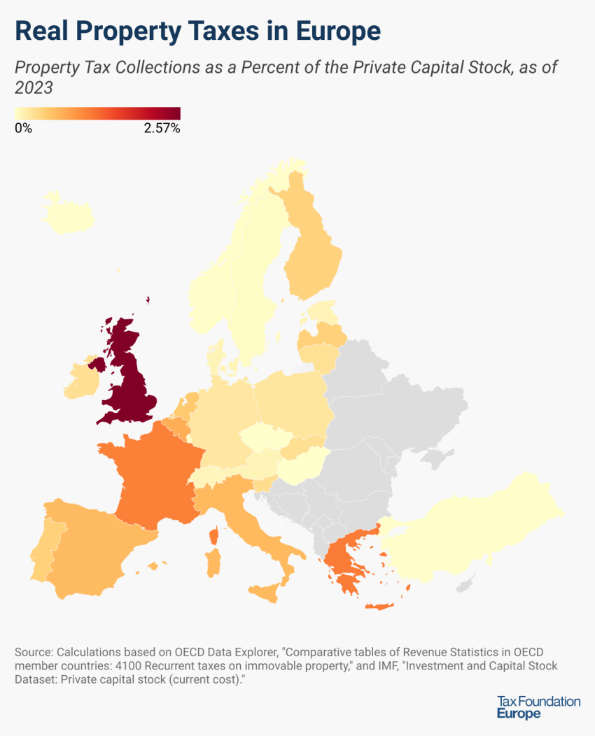 Η Ουγγαρία έχει τα χαμηλότερα έσοδα από φόρους ακίνητης περιουσίας ως ποσοστό του ιδιωτικού κεφαλαίου της, με 0,008%. Η Τσεχική Δημοκρατία έχει το δεύτερο χαμηλότερο ποσοστό, 0,04%, ακολουθούμενη από την Τουρκία, με 0,01%. Οι υψηλότεροι φόροι ακίνητης περιουσίας ως ποσοστό του ιδιωτικού κεφαλαίου καταγράφονται στο Ηνωμένο Βασίλειο (2,57%), την Ελλάδα (1,16%) και τη Γαλλία (1,13%).