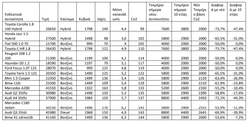 Mε τα σημερινά δεδομένα, προκύπτει μείωση του ποσού ανάλογα με την παλαιότητα, 30% για αυτοκίνητα 5 έως 10 ετών και 50% για αυτοκίνητα άνω των 10 ετών. Ωστόσο, το κόστος συντήρησης είναι προφανές ότι δεν είναι υψηλότερο για τα νεότερα αυτοκίνητα έναντι των παλαιότερων, ενώ η παρούσα κατάσταση λειτουργούσε και αποτρεπτικά για την αγορά νεότερου αυτοκινήτου κάτω της δεκαετίας. Με το νέο σύστημα, η μείωση στα τεκμήρια θα ξεπερνά ακόμα και το 50% στα νεότερα αυτοκίνητα.