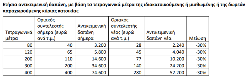Σήμερα τα παραπάνω ποσά προσαυξάνονται, προκειμένου για κατοικίες που βρίσκονται σε περιοχές με τιμή ζώνης από 2.800 ευρώ έως 4.999 ευρώ το τετραγωνικό μέτρο, κατά 40% και για περιοχές με τιμή ζώνης από 5.000 ευρώ και άνω το τετραγωνικό μέτρο, κατά 70%. Πλέον, μειώνονται οι ανωτέρω συντελεστές σε 30% και 58% αντίστοιχα έτσι ώστε σε αυτές τις περιοχές η αντικειμενική δαπάνη να μειωθεί κατά 35%.