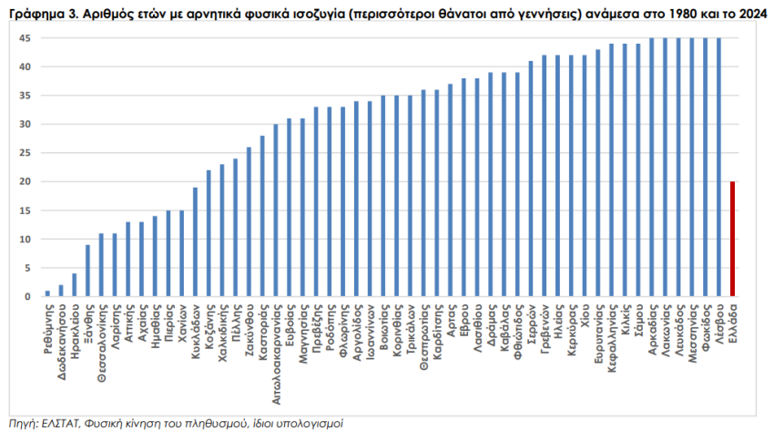 Σύμφωνα με ανάλυση του Ινστιτούτου Δημογραφικών Ερευνών και Μελετών, ενώ σε εθνικό επίπεδο καταγράφονται περισσότεροι θάνατοι από γεννήσεις στα 20 από τα 45 εξεταζόμενα έτη, μεταξύ 1951- 2010, σε περιφερειακό επίπεδο έχουμε στο ένα άκρο 15 νομούς στους οποίους καταγράφονται από το 1980 ως και το 2024 αρνητικά φυσικά ισοζυγία για 41 ή και περισσότερα έτη (!!!) ενώ στο άλλο άκρο σε 3 (Ρέθυμνο, Δωδεκάνησα και Ηράκλειο) καταγράφονται αρνητικά φυσικά ισοζύγια για 1, 2 και 4 αντίστοιχα μόνον χρόνια. 6 νομοί κυμαίνονται γύρω από τον μέσο εθνικό όρο, ενώ σε 19 οι θάνατοι υπερτερούν των γεννήσεων για 30 έως και 39 έτη. Η διαφορά δε ανάμεσα στις ακραίες περιπτώσεις είναι συνταρακτική: σε 6 νομούς (Αρκαδία, Λακωνία, Λευκάδα, Μεσσηνία, Φωκίδα και Λέσβο) καταγράφονται περισσότεροι θάνατοι από γεννήσεις για όλη την εξεταζόμενη περίοδο (για 45 συνεχή χρόνια) ενώ στο Ρέθυμνο για ένα μόνον έτος!
