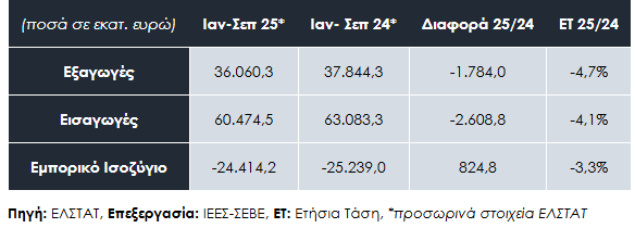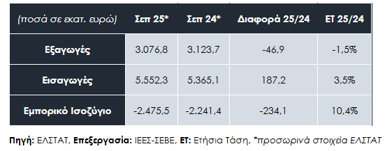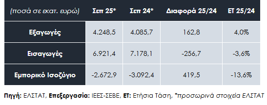 Αντίθετα, πτώση καταγράφηκε στις εισαγωγές, οι οποίες ανήλθαν σε €6.921,4 εκατ. τον Σεπτέμβριο του 2025, από €7.178,1 εκατ. τον αντίστοιχο μήνα του 2024, παρουσιάζοντας μείωση κατά €256,7 εκατ. ή 3,6%. Ως αποτέλεσμα, το έλλειμμα του εμπορικού ισοζυγίου περιορίστηκε, διαμορφούμενο σε €-2.672,9 εκατ. έναντι €-3.092,4 εκατ. τον Σεπτέμβριο του 2024, σημειώνοντας μείωση κατά €419,5 εκατ. ή 13,6%.