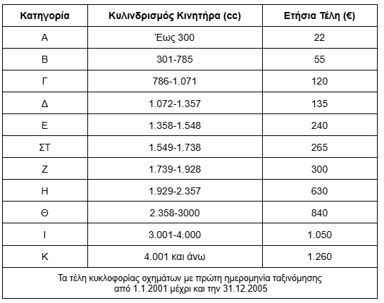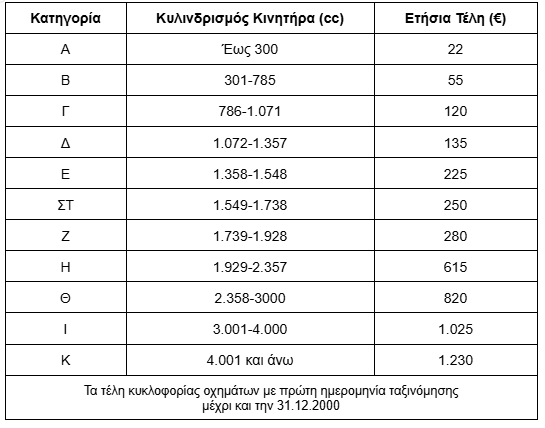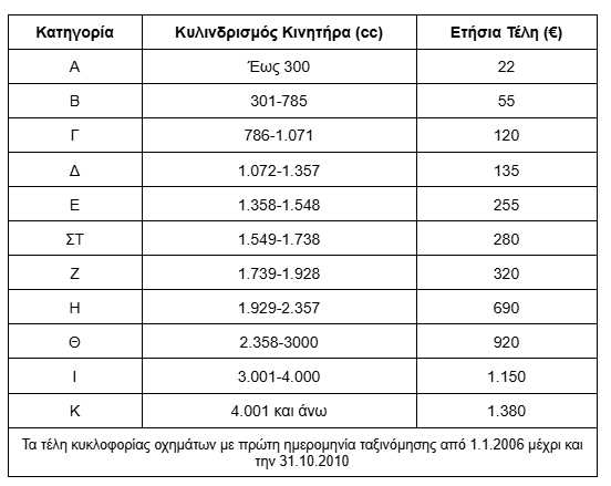 Παρακάτω θα βρεις τους πίνακες με τα τέλη κυκλοφορίας της κάθε κατηγορίας. Τα τέλη υπολογίζονται σύμφωνα με τον κυβισμό του κινητήρα.