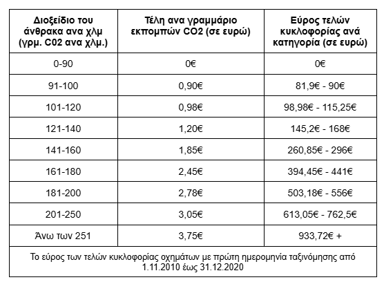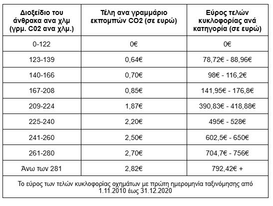 - Τα οχήματα που ταξινομήθηκαν για πρώτη φορά την 1.11.2010 ή αργότερα. Των οποίων τα τέλη κυκλοφορίας υπολογίζονται σύμφωνα με τις εκπομπές διοξειδίου του άνθρακα του οχήματος.