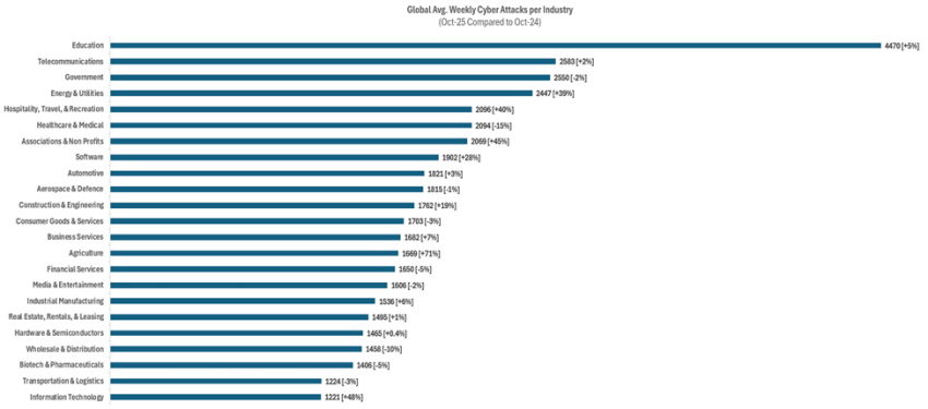 Τον Οκτώβριο, ο παγκόσμιος όγκος των κυβερνοεπιθέσεων συνέχισε την ανοδική του πορεία. Οι οργανισμοί παγκοσμίως αντιμετώπισαν κατά μέσο όρο 1.938 κυβερνοεπιθέσεις την εβδομάδα, σημειώνοντας αύξηση 2% από τον Σεπτέμβριο και 5% σε σύγκριση με τον Οκτώβριο του 2024!