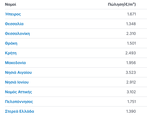 Η μέση ζητούμενη τιμή για ακίνητα προς πώληση ήταν υψηλότερη στα νησιά του Αιγαίου, με € 3.523 ανά τ.μ. Στον αντίποδα, για τα ακίνητα προς πώληση στη Θεσσαλία, η μέση ζητούμενη τιμή διαμορφώνεται στα € 1.348 ανά τ.μ., που είναι και η χαμηλότερη σε όλη την Ελλάδα.