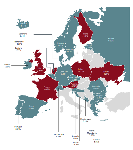 Σύμφωνα με την έκθεση της Global Property Guide για την παγκόσμια αγορά ακινήτων, οι ευρωπαϊκές αγορές κατοικιών που κατέγραψαν ήπια μεν, αλλά αύξηση των τιμών των κατοικιών κατά τη διάρκεια του έτους έως το δεύτερο τρίμηνο του 2025 ήταν η Ιρλανδία (5,99%), η Βοσνία-Ερζεγοβίνη (5,56%), η Κύπρος (5,07%), η Ελλάδα (4,75%), η Ελβετία (4,39%), τη Σερβία (4,34%), το Λουξεμβούργο (3,52%), τη Σλοβενία (3,38%), τη Λιθουανία (2,98%), τη Μάλτα (2,64%), τη Σουηδία (2,52%), το Βέλγιο (2,39%) και την Ιταλία (2,17%). Όλες, με εξαίρεση τη Μάλτα και το Βέλγιο, παρουσίασαν και αύξηση τιμών από τρίμηνο σε τρίμηνο.