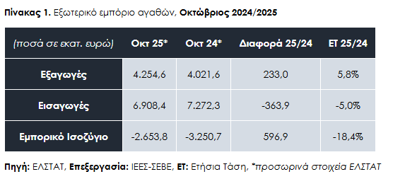 Συγκεκριμένα, σύμφωνα με τον Πίνακα 1, η συνολική αξία των εξαγωγών αγαθών ανήλθε σε €4.254,6 εκατ., έναντι €4.021,6 εκατ. τον Οκτώβριο του 2024, σημειώνοντας αύξηση κατά €233,0 εκατ. ή 5,8%. Αντίθετα, πτώση καταγράφηκε στις εισαγωγές, οι οποίες ανήλθαν σε €6.908,4 εκατ. τον Οκτώβριο του 2025, από €7.272,3 εκατ. τον αντίστοιχο μήνα του 2024, παρουσιάζοντας μείωση κατά €363,9 εκατ. ή 5,0%. Ως αποτέλεσμα, το έλλειμμα του εμπορικού ισοζυγίου περιορίστηκε, διαμορφούμενο σε €-2.653,8 εκατ. έναντι €-3.250,7 εκατ. τον Οκτώβριο του 2024, σημειώνοντας μείωση κατά €596,9 εκατ. ή 18,4%.