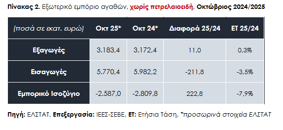 Αν εξαιρεθούν τα πετρελαιοειδή, οι εξαγωγές αγαθών κατά την περίοδο Ιανουαρίου–Οκτωβρίου 2025 ανήλθαν σε €30.749,9 εκατ., καταγράφοντας αύξηση κατά €801,3 εκατ. ή 2,7% σε σύγκριση με την αντίστοιχη περίοδο του 2024, όπου είχαν διαμορφωθεί σε €29.948,6 εκατ. Αντίστοιχα, οι εισαγωγές χωρίς πετρελαιοειδή αυξήθηκαν κατά €1.172,3 εκατ. ή 2,2%, φτάνοντας τα €54.606,3 εκατ. έναντι €53.434,0 εκατ. το 2024. Ως εκ τούτου, το έλλειμμα του εμπορικού ισοζυγίου χωρίς πετρελαιοειδή παρουσίασε επιδείνωση, καθώς διαμορφώθηκε σε €-23.856,4 εκατ., αυξημένο κατά €371,0 εκατ. ή 1,6% σε σχέση με το αντίστοιχο διάστημα του προηγούμενου έτους.
