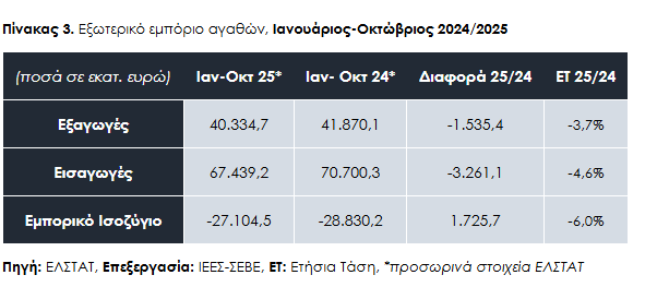 Αντίστοιχη πτωτική πορεία σημειώθηκε και στις εισαγωγές, οι οποίες ανήλθαν σε €67.439,2 εκατ. έναντι €70.700,3 εκατ. το ίδιο διάστημα του προηγούμενου έτους, παρουσιάζοντας μείωση κατά €3.261,1 εκατ. ή 4,6%. Ως εκ τούτου, το έλλειμμα του εμπορικού ισοζυγίου παρουσίασε βελτίωση, καθώς περιορίστηκε σε €-27.104,5 εκατ. από €-28.830,2 εκατ. το 2024, με τη διαφορά να ανέρχεται σε €1.725,7 εκατ. ή 6,0%.