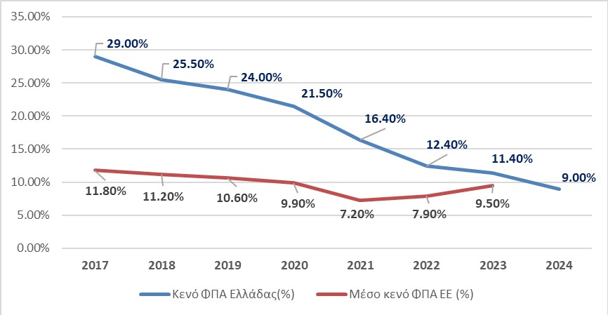Η πτωτική τάση του κενού ΦΠΑ στην Ελλάδα συνεχίζεται, με τις προκαταρκτικές εκτιμήσεις για το 2024 να προβλέπουν περαιτέρω μείωσή του στο 9%.