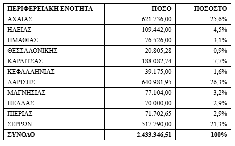 Συγκεκριμένα, με την 5η κατανομή καταβλήθηκαν 2.433.346,51 €, ενισχύοντας σημαντικά τις Περιφερειακές Ενότητες Λάρισας (26,3%), Αχαΐας (25,6%) και Σερρών (21,3%).